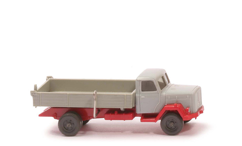 | Farbe Kabine | silbergrau | | Verglasung | getönt | | Bemalung vorn | Scheinwerfer silbern | | Chassis Farbe | rot | | Chassis Art | Version 4 | | hinterer Chassisbereich | geschlossen | | Chassis Bodenprägung | WM, Germany | | Abdeckplatte des Kipphebels | rot | | Kippscharnier | rot | | Pritsche Art | Flachbord ohne Wulst | | Pritsche Farbe | silbergrau vergilbt | | bewegliche Heckklappe | silbergrau vergilbt | | Rückleuchten und Kennzeichen | an Pritsche | | Bemalung hinten | ohne | | Kipphebel | auf Beifahrerseite | | Räder | 11mm, einteilig anthrazit |
