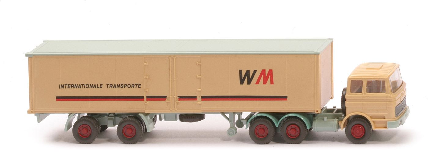 | | Zugmaschine | | Typ | Dach längsversteift | | Kabine | hellbeige | | Spiegel | ohne | | Scheibenwischer | ohne | | Verglasung | klar | | Lenkrad | ohne | | Inneneinrichtung | ca. lichtgrau | | Stoßstange | lichtgrün, Scheinwerfer gesilbert | | Chassis | lichtgrün | | Zentriernippel für Pritsche | ohne | | Radlauf hinten | zweiteilig türkis | | Reserverad | hinter Kabine | | Sattelpfanne | für großen KöBo | | Räder | Profil grob | | Felgen | hellbraunrot | | | Auflieger | | Koffer Typ | mit Andeutung der Seitentür | | Koffer Seiten | mattiert, 8-fach geteilt | | Farbe Dach | lichtgrün | | Farbe Korpus | hellbeige | | Farbe Türen | hellbeige | | Beschriftung | Internationale Transporte WM | | Beschriftung Art | Druck rot/schwarz | | Gestaltung Streifen | Streifen rot/schwarz zusammenliegend | | Chassis Farbe | lichtgrün | | Unterfahrschutz | ohne | | Königsbolzen | stark | | Räder | Profil grob | | Felgen | hellbraunrot |