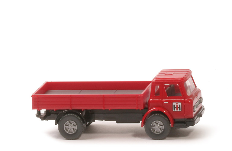 | Farbe Kabine | rubinrot | | Dachlüfter | mit | | Grill | silbern eingesetzt | | Bedruckung Front | IH-Emblem, Scheinwerfer silbern | | Bedruckung Türen | IH-Emblem rot und schwarz auf weiß | | Inneneinrichtung | ca. staubgrau, ohne Lkr | | Verglasung | klar | | Chassis | schwarz | | Bodenprägung | WM (alt), Germany | | Zughaken | ins Chassis integriert | | Reserverad | ohne | | hinterer Radlauf | schwarz | | Pritsche | rubinrot | | Pritscheneinlage | silbern, 3-teilig | | Bedruckung Rückleuchten | rot | | Räder | 12 mm, Felgen eingesetzt | | Felgen | Trilex neu, silbern |