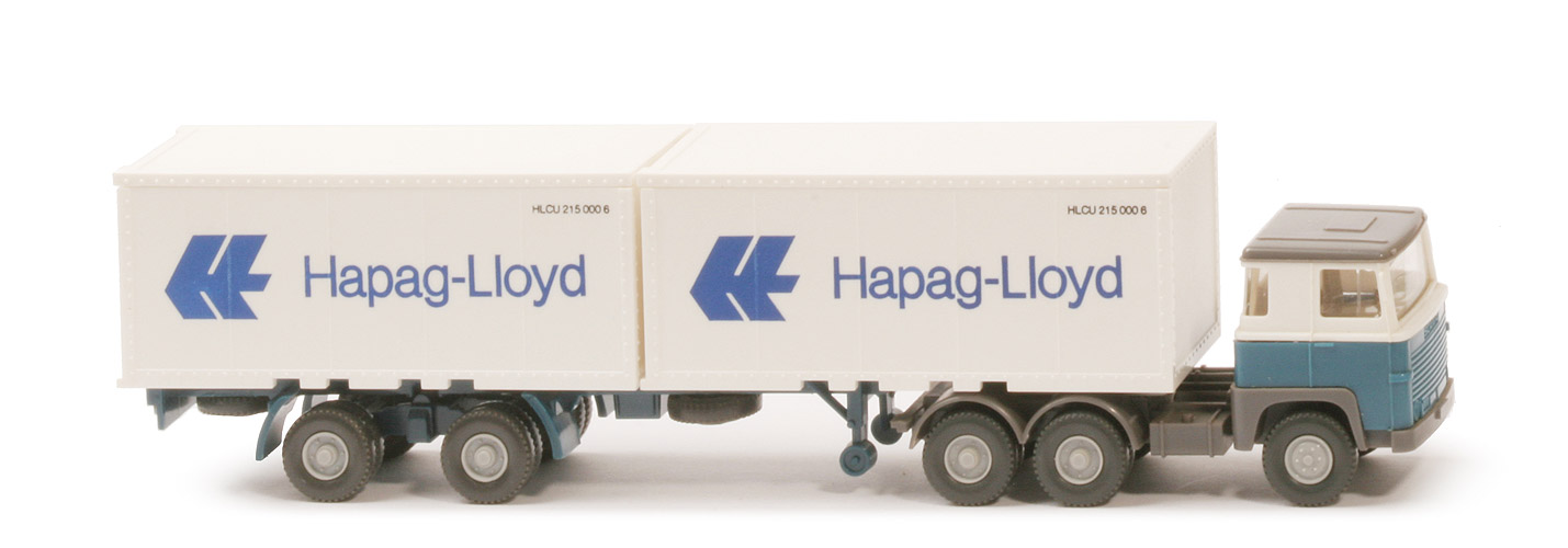 | Zugmaschine | Dach | basaltgrau | Kabine oben | weiß | Kabine unten | azurblau | Stoßstange | basaltgrau | Scheinwerfer | 2, ungesilbert | Spiegel | mit | Scheibenwischer | ohne | Lenkrad | mit | hinterer Radlauf | azurblau | Sattelpfanne | für großen Königsbolzen | Reserverad | ohne | Chassis Farbe | azurblau | Räder | 12mm, Profil grob | Felgen | silbergrau | | Container | Art | 2 x 20 ft Glattwand | Dach | weiß | Korpus | weiß | Türen | neu, weiß | Beschriftung | Hapag-Lloyd ... (s. Foto) | Nummer | mit | | Auflieger | Farbe | ozeanblau | Unterfahrschutz | ohne | Königsbolzen | stark | Räder | 12mm, Profil grob | Felgen | silbergrau |