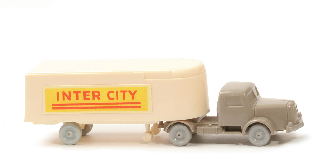 Achsen | Rollachser | | Zugmaschine | Farbe Kabine | braunelfenbein | Farbe Chassis | braunelfenbein | Bemalung | Scheinwerfer, Stoßstange | Sattelpfanne | eingesetzt, in Chassisfarbe | Chassis | Version 1a | Achshalterungen | geschlossen | Bodenprägung | WM im Kreis | Reserverad | hinter Kabine | Räder | sog. Porzellanräder | | Auflieger | Farbe Oberteil | creme | Farbe Unterteil | creme | Radlauf | ohne Kotflügel | Bodenprägung | WM im Kreis | Rückleuchten | ohne | Dach | glänzend | Aufkleberart | Papier, matt | Beschriftung | Inter City (s. Foto) | Beschriftung Farbe | gelb mit roter Schrift | Räder | sog. Porzellanräder |