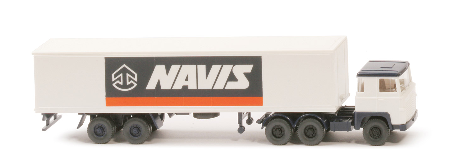 | Zugmaschine | Dach | stahlblau | Kabine oben | weiß | Kabine unten | weiß | Stoßstange | stahlblau | Scheinwerfer | 2, ungesilbert | Spiegel | mit | Scheibenwischer | mit | Lenkrad | mit | hinterer Radlauf | stahlblau | Sattelpfanne | für großen Königsbolzen | Reserverad | unter Chassis | Chassis Farbe | stahlblau | Räder | 12mm, Profil grob | 8-Loch-Felgen | silbergrau | | Auflieger | Dach | weiß | Korpus | weiß | Türen | neu, weiß | Beschriftung Fahrerseite | Navis (s. Foto) | Beschriftung Beifahrerseite | Navis (s. Foto) | | Auflieger | Farbe | stahlblau | Unterfahrschutz | mit | Königsbolzen | stark | Räder | 12mm, Profil grob | 8-Loch-Felgen | stahlblau |