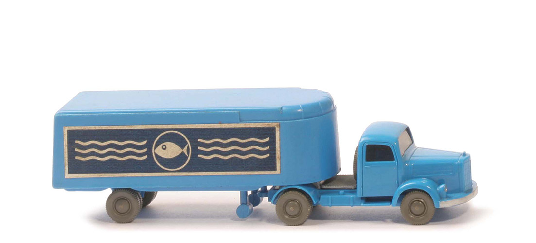 | Zugmaschine | Farbe Kabine | himmelblau | Farbe Chassis | himmelblau | Bemalung | Scheinwerfer, Stoßstange | Sattelpfanne | alt, ohne Steg, für kleinen KöBo | Achshalterungen | geschlossen | Bodenprägung | WM (ohne Kreis) | Reserverad | hinter Kabine | Räder | neuere Ausführung | | Auflieger | Farbe Oberteil | lichtblau | Farbe Unterteil | himmelblau | Radlauf | ohne Kotflügel | Bodenprägung | WM im Kreis | Rückleuchten | ohne | Dach | glänzend | Aufkleberart | Papier, matt | Beschriftung | Fisch mit Wellen (s. Foto) | Räder | neuere Ausführung |