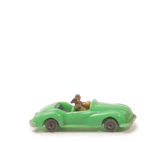 Achsen | Drahtachser | Farbe Karosserie | froschgrün | Andeutung Kofferraumdeckel | mit | Lenkrad | vergossen an Figuren | Passagiere | ca. grün-goldmetallic | Sitze | blau | Bodenprägung | ohne | Fließnaht | mit | Bemalung Scheinwerfer | silber | Bemalung Stoßstange vorne | silber (Reste) | Bemalung Kennzeichen vorne | silber (Reste) | Bemalung Rückleuchten hinten | rot (Reste) | Bemalung Kennzeichen hinten | silber (Reste) | Bemalung Stoßstange hinten | silber (Reste) | Räder Typ | Nabe vorgewölbt | Räder Farbe | glasiges grau |