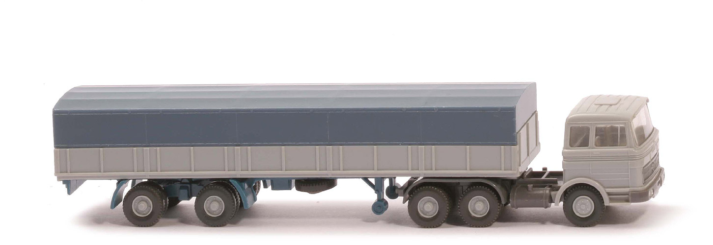 | Zugmaschine | Typ | Dach querversteift | Kabine | silbergrau | Spiegel | ohne | Scheibenwischer | ohne | Verglasung | klar | Lenkrad | ohne | Inneneinrichtung | ca. hellgelbgrau | Stoßstange | basaltgrau, Scheinwerfer ungesilbert | Chassis | basaltgrau | Zentriernippel für Pritsche | mit | Radlauf hinten | einteilig basaltgrau | Reserverad | ohne | Sattelpfanne | für großen KöBo | Räder | Profil grob | Felgen | silbergrau | | Auflieger | Pritsche Farbe | silbergrau | Chassis Farbe | azurblau | Pritscheneinlage | Pappe, silbern | Plane Farbe | taubenblau | Reserverad | unter Auflieger, gesteckt | Unterfahrschutz | ohne | Königsbolzen | stark | Räder | Profil grob | Felgen | silbergrau |