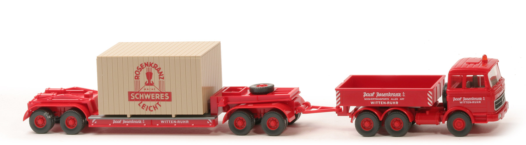Das Modell kann als Tieflade-Sattelzug 3/2 gefahren werden oder mittels der beigefügten Lastpritsche und des Drehschemels als Tieflade-Anhängerzug 3/4. Die Bedruckung des Modells ist wie bei der Rosenkranz-Serie üblich sehr umfangreich. Der schwarze Grill hat einen gesilberten Rand und der Stern und die Scheinwerfer sind gesilbert. Die Front und die Seiten der Kabine tragen "Rosenkranz"-Schriftzüge. Die Lastpritsche hat den Ecken Warnbaken und hinten und an den Seiten die Beschriftung "Paul Rosenkranz A.G./ Schwertransporte aller Art Witten-Ruhr". Die Lastpritsche trägt seitlich die Beschriftung "Paul Rosenkranz A.G. Witten-Ruhr" und die Kiste "Rosenkranz macht schweres leicht". Ein schön gestaltetes Modell, dass auch schnell ausverkauft war.