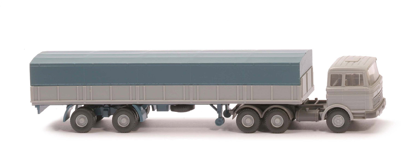 | | Zugmaschine | | Typ | Dach querversteift | | Kabine | silbergrau | | Spiegel | ohne | | Scheibenwischer | ohne | | Verglasung | klar | | Lenkrad | ohne | | Inneneinrichtung | ca. lichtgrau | | Stoßstange | basaltgrau, Scheinwerfer gesilbert | | Chassis | basaltgrau | | Zentriernippel für Pritsche | ohne | | Radlauf hinten | zweiteilig basaltgrau | | Reserverad | ohne | | Sattelpfanne | für großen KöBo | | Räder | Profil grob | | Felgen | silbergrau | | | Auflieger | | Pritsche Farbe | silbergrau | | Chassis Farbe | diamantblau | | Pritscheneinlage | Pappe, silbern | | Plane Farbe | diamantblau | | Reserverad | unter Auflieger, gesteckt | | Unterfahrschutz | ohne | | Königsbolzen | stark | | Räder | Profil grob | | Felgen | silbergrau |
