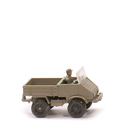 | Farbe Kabine und Pritsche | olivgrau | | Frontscheibe | Plastik | | Grill | gröbere Struktur, waagerechte Vertiefungen | | Türen | erhaben, mit Scharnieren und Türgriffen | | Inneneinrichtung Ausführung | separat eingesetzt | | Inneneinrichtung Farbe | patinagrün | | Fahrerfigur Farbe | ca. basaltgrau | | Lenkrad | separat eingesetzt, anthrazit | | Bemalung Fahrer | Gesicht | | Pritschenseiten | gerade Verbretterung | | Farbe Chassis | olivgrau | | Bodenprägung | WM, Germany, 37 n | | Kardaneinheit | separat eingesetzt | | Farbe Kardaneinheit | patinagrün | | Rückleuchten | an der Rücklichtstange des Chassis | | Reserverad | auf Chassis | | Pritscheneinlage | silbern | | Bemalung Front | Scheinwerfer silbern | | Bemalung Heck | ohne | | Räder | 10 mm, anthrazit, grobes Profil Unimog |