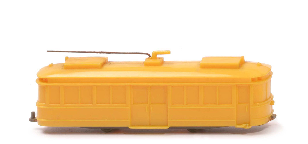 | Achsen | Rollachser | | Farbe Karosserie | gelb | | Scheiben | nicht gesilbert | | gewinkelter Isolator | mit | | extra Halterung Stromabnehmer | ohne | | Stromabnehmer | Stange, eingeschmolzen | | Chassis Typ | mit Kupplungen (vorne abgebrochen) | | Achshalterung | mittige Fixierung | | Chassis Farbe | basaltgrau misch | | Bodenprägung | WM | | Räder | glasig basaltgrau |