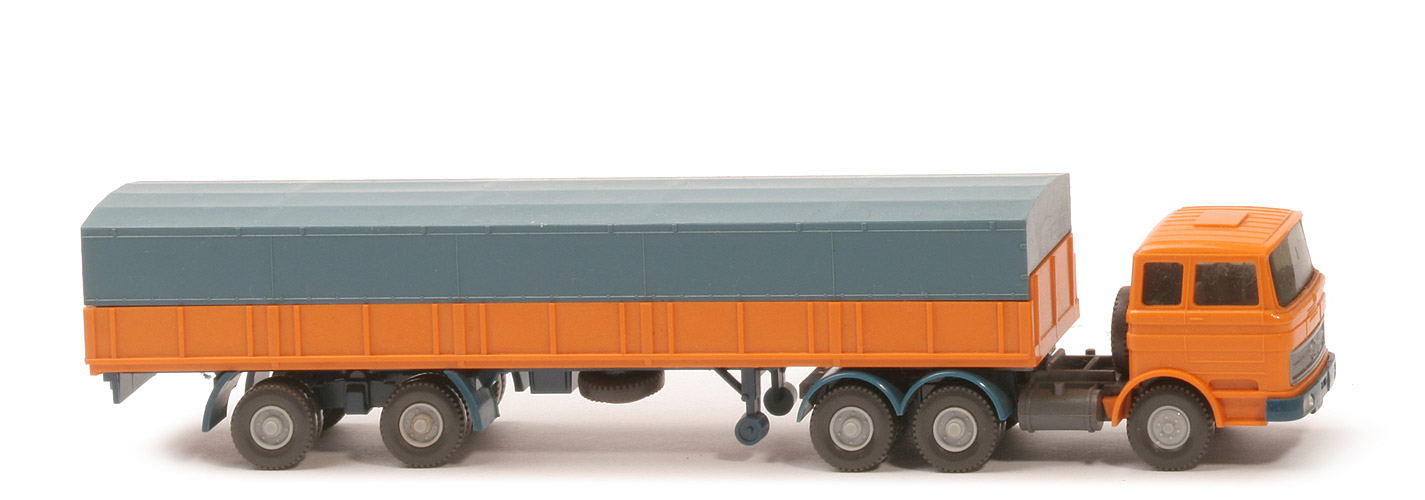 | Zugmaschine | Typ | Dach längsversteift | Kabine | gelborange | Spiegel | ohne | Scheibenwischer | ohne | Verglasung | stark getönt | Lenkrad | ohne | Inneneinrichtung | ca. hellgelbgrau | Stoßstange | ozeanblau, Scheinwerfer gesilbert | Chassis | basaltgrau | Zentriernippel für Pritsche | ohne | Radlauf hinten | zweiteilig ozeanblau | Reserverad | hinter Kabine | Sattelpfanne | für großen KöBo | Räder | Profil grob | Felgen | silbergrau | | Auflieger | Pritsche Farbe | gelborange | Chassis Farbe | ozeanblau | Pritscheneinlage | ohne | Plane Farbe | diamantblau | Reserverad | unter Auflieger, gesteckt | Unterfahrschutz | ohne | Königsbolzen | stark | Räder | Profil grob | Felgen | silbergrau |