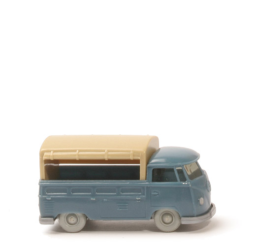 Farbe Karosserie | mattgraublau | Fenstersteg Frontscheibe | schmal | Blinker vorne | ohne | Verglasung | getönt | Inneneinrichtung | ohne | Chassis Ausführung | separates Bauteil | Chassis Farbe | silbern | Bodenprägung | WM Made in Germany | Bemalung Scheinwerfer | silbern | Bemalung VW-Emblem | ohne | Bemalung Rückleuchten | rot | Bemalung Kennzeichen hinten | silbern | Räder | ca. lichtgrau, Nabe gewölbt |