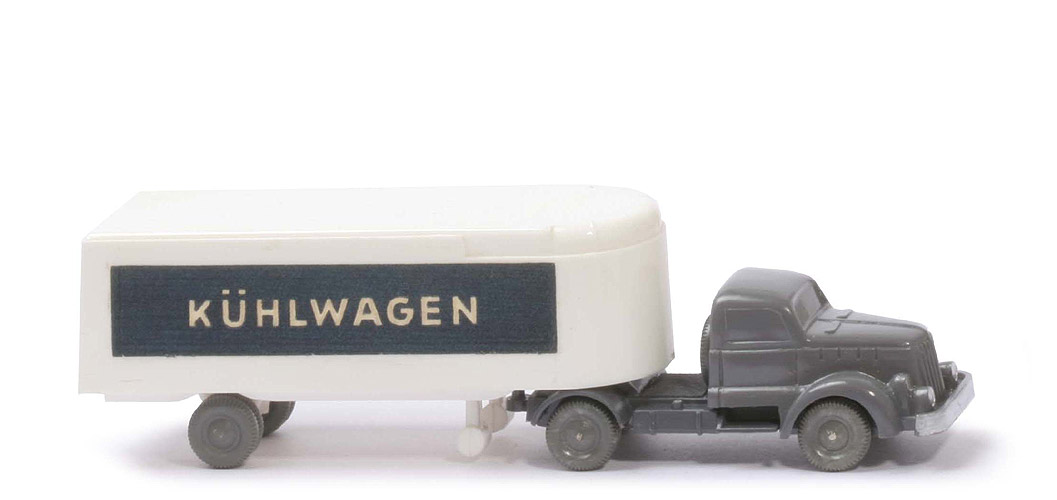 Achsen | Rollachser | | Zugmaschine | Farbe Kabine | basaltgrau | Farbe Chassis | basaltgrau | Bemalung | Scheinwerfer, Stoßstange | Sattelpfanne | eingesetzt, in Chassisfarbe | Chassis | Version 1b | Achshalterungen | geschlossen | Bodenprägung | WM (ohne Kreis) | Reserverad | hinter Kabine | Räder | 10 mm, mit Profil, staubgrau | | Auflieger | Farbe Oberteil | weiß | Farbe Unterteil | weiß | Radlauf | ohne Kotflügel | Bodenprägung | WM im Kreis | Rückleuchten | ohne | Dach | glänzend | Aufkleberart | Papier, matt | Beschriftung | Kühlwagen (s. Foto) | Beschriftung Farbe | blau mit weißer Schrift | Räder | 10 mm, mit Profil, staubgrau |
