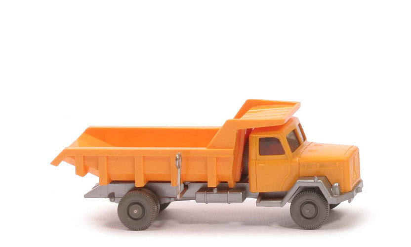 | Farbe Kabine | chromgelb | | Verglasung | getönt | | Bemalung vorn | ohne | | Reserverad | ohne | | Chassis Farbe | silbern | | Chassis Art | Version 3 | | hinterer Chassisbereich | geschlossen | | Chassis Bodenprägung | nur WM (ohne Germany) | | Abdeckplatte des Kipphebels | silbern | | Kippscharnier | silbern | | Mulde Art | ohne 2 Längsgravuren Innenfläche hinten | | Mulde Farbe | chromgelb | | Rückleuchten und Kennzeichen | ohne | | Bemalung hinten | ohne | | Kipphebel | auf Beifahrerseite, senkrecht stehend | | Räder | 11 mm, Glattwand, ca. staubgrau |