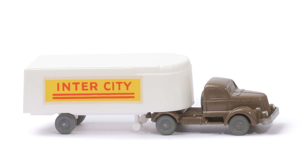 Achsen | Rollachser | | Zugmaschine | Farbe Kabine | blassbraun | Farbe Chassis | blassbraun | Bemalung | Scheinwerfer, Stoßstange | Sattelpfanne | eingesetzt, in Chassisfarbe | Chassis | Version 1a | Achshalterungen | geschlossen | Bodenprägung | WM (ohne Kreis) | Reserverad | hinter Kabine | Räder | 10mm, mit Profil, ca. basaltgrau | | Auflieger | Farbe Oberteil | weiß | Farbe Unterteil | weiß | Radlauf | ohne Kotflügel | Bodenprägung | WM im Kreis | Rückleuchten | ohne | Dach | glänzend | Aufkleberart | Papier, matt | Beschriftung | Inter City (s. Foto) | Beschriftung Farbe | gelb mit roter Schrift | Räder | 10mm, mit Profil, ca. basaltgrau |