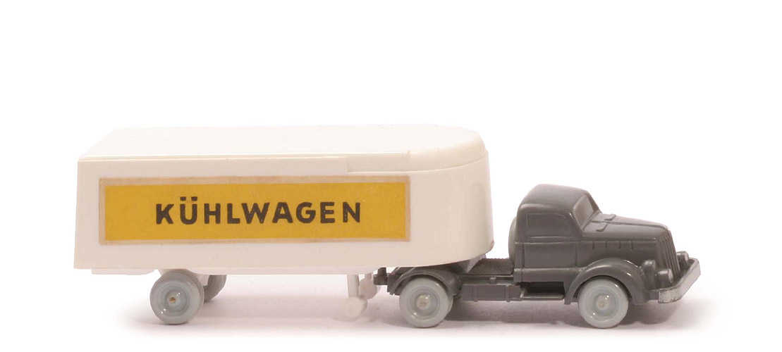 Achsen | Rollachser | | Zugmaschine | Farbe Kabine | basaltgrau | Farbe Chassis | basaltgrau | Bemalung | Scheinwerfer, Stoßstange | Sattelpfanne | eingesetzt, in Chassisfarbe | Chassis | Version 1b | Achshalterungen | geschlossen | Bodenprägung | WM (ohne Kreis) | Reserverad | hinter Kabine | Räder | sog. Porzellanräder | | Auflieger | Farbe Oberteil | weiß | Farbe Unterteil | weiß | Radlauf | ohne Kotflügel | Bodenprägung | WM im Kreis | Rückleuchten | ohne | Dach | glänzend | Aufkleberart | Papier, matt | Beschriftung | Kühlwagen (s. Foto) | Beschriftung Farbe | gelb mit blauer Schrift | Räder | sog. Porzellanräder |