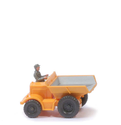 Farbe Karosserie | melonengelb | Ausführung Motorabdeckung | 2 Nippel | Bodenprägung | WM, Germany, 65 S | Farbe Mulde | melonengelb | Silberung Mulde | mit | Lenkrad Farbe | ca. hellgelbgrau | Fahrer | mit, ca. basaltgrau | Bemalung Fahrer | Gesicht, Hände | Räder Farbe | anthrazit | Räder Typ vorne | 12mm einteilig, Profil grob, 10-Loch | Räder Typ hinten | 10mm, Profil grob, 6-Loch | Bemalung Rückleuchten | ohne |