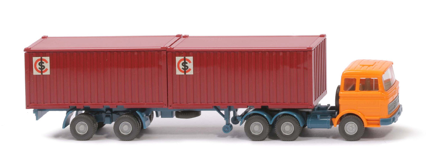 | Zugmaschine | Typ | Dach querversteift | Kabine | orangegelb | Spiegel | mit | Lenkrad | ohne | Scheibenwischer | ohne | Inneneinrichtung | ca. graubeige | Stoßstange | azurblau, Scheinwerfer ungesilbert | Chassis | azurblau, mit Zentriernippel | Radlauf hinten | zweiteilig azurblau | Reserverad | hinter Kabine | Räder | 12 mm, Profil grob | Felgen | silbergrau | | Container | Art | 2 x 20 ft Stahlcontainer ohne Aussparung | Farbe | rubinrot | Türen | für Stahlcontainer | Beschriftung | Papieraufkleber "ICS" klein 8 x 8 mm | | Auflieger | Farbe | azurblau | Unterfahrschutz | ohne | Königsbolzen | stark | Räder | Profil grob | Felgen | silbergrau |