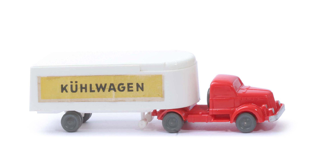 Achsen | Rollachser | | Zugmaschine | Farbe Kabine | orangerot | Farbe Chassis | orangerot | Bemalung | Scheinwerfer, Stoßstange | Sattelpfanne | eingesetzt, in Chassisfarbe | Chassis | Version 1b | Achshalterungen | geschlossen | Bodenprägung | WM im Kreis | Reserverad | hinter Kabine | Räder | 10 mm, mit Profil, staubgrau | | Auflieger | Farbe Oberteil | weiß | Farbe Unterteil | weiß | Radlauf | ohne Kotflügel | Bodenprägung | WM im Kreis | Rückleuchten | ohne | Dach | glänzend | Aufkleberart | Papier, matt | Beschriftung | Kühlwagen (s. Foto) | Beschriftung Farbe | gelb mit blauer Schrift | Räder | 10 mm, mit Profil, staubgrau |