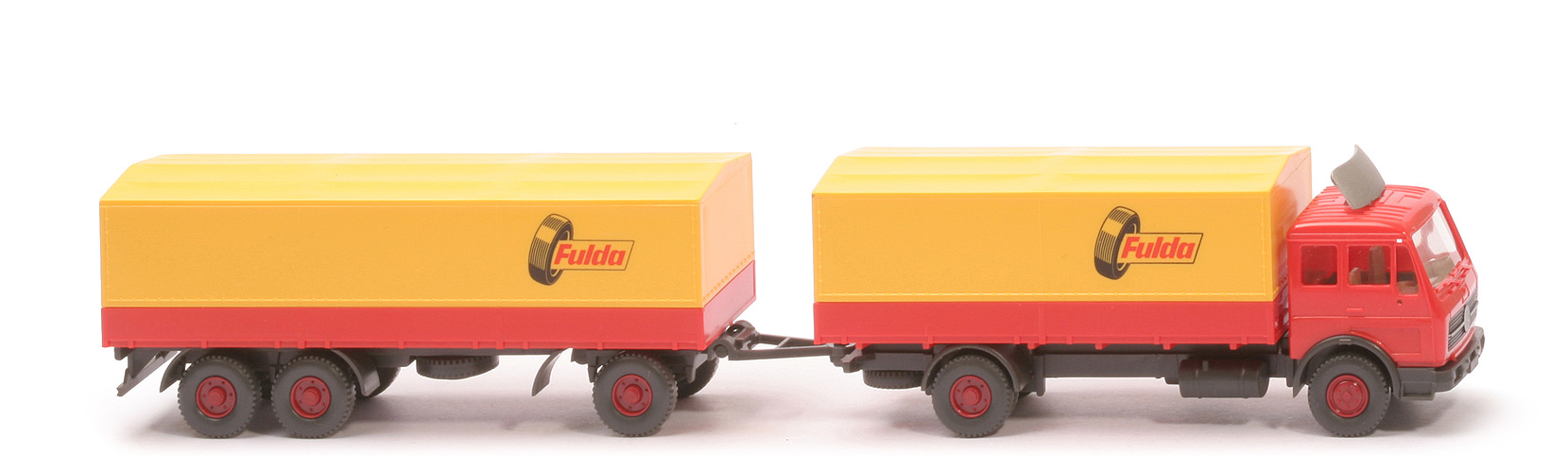 | Zugwagen | Kabine | orangerot | eingesetzter Grill | schwarz, mit Streifen | Spoiler | silbern | Heckfenster | offen | Spiegelaufnahmen | mit | Inneneinrichtung | ca. hellolivgrau | Stoßstange | anthrazit | Chassis | anthrazit | Bodenprägung Chassis | WIKING, Berlin-W | Radlauf hinten | anthrazit | Reserverad | hinten unter Chassis | Pritsche | orangerot | Pritscheneinlage | Pappe, weiß mit dünnen schwarzen Längsstreifen | Plane | gelb | Beschriftung | Fulda ... (s. Foto) | Räder | Profil grob | Felgen | hellbraunrot, 6-Loch | | Anhänger | Pritsche | orangerot | Chassis | anthrazit | Bodenprägung Chassis | WIKING, Berlin-W | Doppelachsaggregat | anthrazit | Drehschemel | anthrazit | Pritscheneinlage | Pappe, weiß mit dünnen schwarzen Längsstreifen | Plane | gelb | Beschriftung | Fulda ... (s. Foto) | Räder | Profil grob | Felgen | hellbraunrot, 6-Loch |