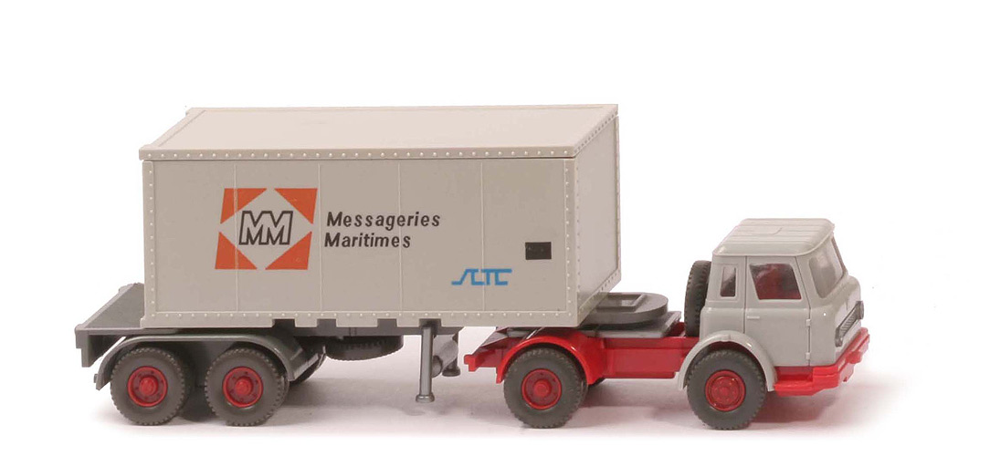 | | Zugmaschine | | Kabine | silbergrau | | Lüfter | mit | | Inneneinrichtung | rot | | Verglasung | klar | | Chassis | rot | | Radlauf hinten | rot | | Sattelpfanne | für großen Königsbolzen | | Reserverad | hinter Kabine | | Räder | Profil grob | | Felgen | hellbraunrot | | | Container | | Art | 20 ft Glattwand | | Farbe | achatgrau | | Türen | alt | | Beschriftung | Messageries Maritimes (s. Foto) | | Beschriftung Art | Druck orangerot/schwarz/blau | | | Auflieger | | Farbe | basaltgrau | | Variante | mit Markierung, mit Bohrungen neben KoBo | | Reserverad | unter Auflieger, gesteckt | | Bodenprägung | 52h | | Doppelachsaggregat Farbe | basaltgrau | | Doppelachsaggregat Typ | Klemmplatte WIKING u. GERMANY | | Hydraulikstützen | silbern, gesteckt | | Räder | Profil grob | | Felgen | hellbraunrot |