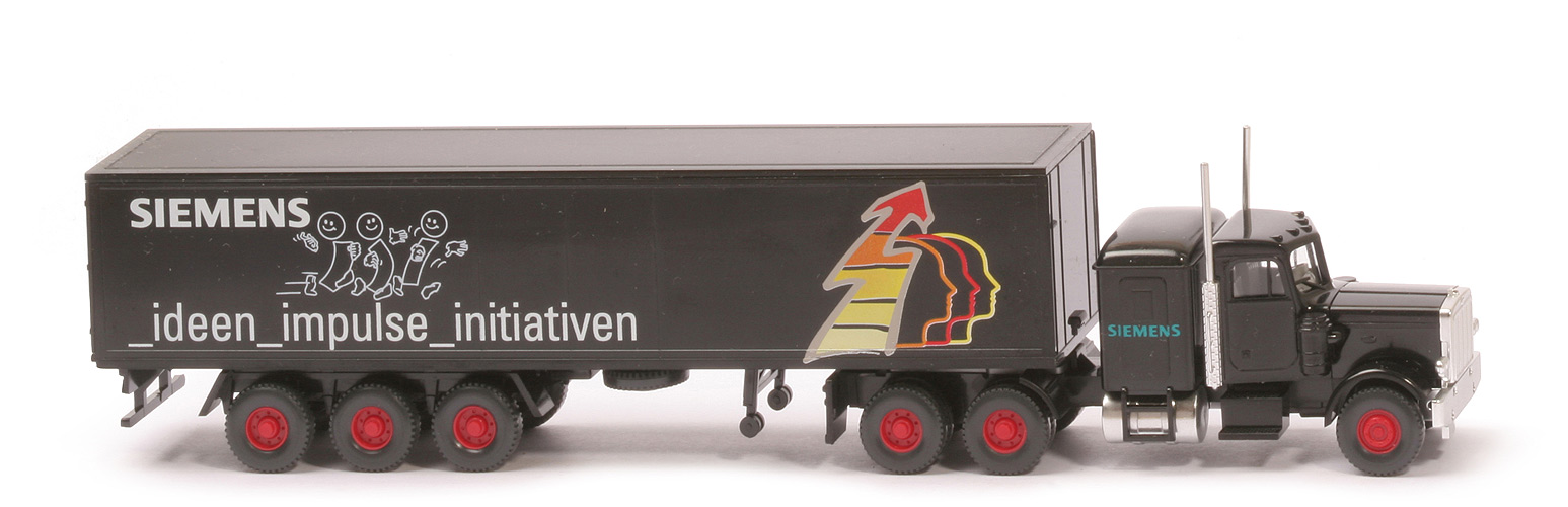 | Zugmaschine | Kabine | schwarz, mit Scheibenwischern | Dach | mit 5 Positionsleuchten | Haube/vordere Kotflügel | schwarz, kippbar, Blinker auf Kotflügel | Seitenaggregate | schwarz | Grill, Scheinwerfer, Stoßst. | verchromt, mit Kennzeichen | Schlafkabine | schwarz | hier Dach | schwarz | Auspuffrohre, Tanks | verchromt | Chassis, Motor, Kotflügel, ... | schwarz | Kardanplatte | schwarz | hier Bodenprägung | neues WIKING-Logo, Germany | Sattelpfanne | silbern, für großen Königsbolzen | Bedruckung Schlafkabine | "Siemens" in grün | Reserverad | ohne | | Auflieger | Typ | Koffer, Chassis gesteckt | Farbe | schwarz | Türen | nicht zu öffnen, schwarz | Beschriftung Seiten | "Siemens, ideen, impulse ..." | weitere Beschriftung | ohne | Beschriftung Art | Druck weiß, gelb, orange, rot | Chassis | schwarz, mit Unterfahrschutz | Chassis Bodenprägung | neues WIKING-Logo, Germany | Dreiachsaggregat Typ | gesteckt, Kotflügel eckig | Dreiachsaggregat Farbe | schwarz | Reserverad | unter Chassis gesteckt | Stütze | Rollen, schwarz | | Räder | Typ | 12 mm, 2-teilig, Felgen eingesetzt | Felgen | 8-Loch rot |