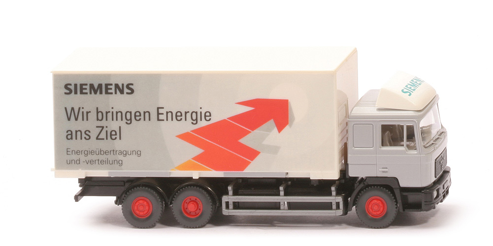 Kabine | silbergrau | Spoiler | weiß, Druck "Siemens" grün | eingesetzter Grill | schwarz | Bedruckung Grill | Rand, MAN-Logo, Löwe silbern | Inneneinrichtung | ca. platingrau, Lkr separiert | Kabinenunterbau | schwarz | Stoßstange, Kotflügel | schwarz | Chassis | schwarz, filigran | Kardaneinsatz | schwarz, Bodenprägung neues WIKING-Logo, Germany | Radlauf hinten | schwarz | Reserverad | ohne | seitlicher Unterfahrschutz | silbern | Aufbau/Kofferaufnahme | schwarz | Koffer Dach | weiß | Koffer Korpus | weiß | Koffer Türen | weiß | Koffer Stützen | silbergrau | Beschriftung Fahrerseite | "Anstöße für neue Ideen ..." (s. Foto) | Beschriftung Beifahrerseite | "Wir bringen Energie ans Ziel ..." (s. Foto) | Beschriftung Art | Druck | Räder | 12 mm, Felgen eingesetzt | Felgen | 8-Loch, rot |