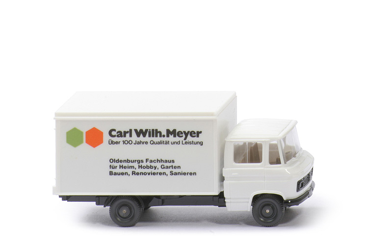Farbe Kabine | weiß | Scheibenwischer | mit | Verglasung | klar | Inneneinrichtung | ca. graubeige | Lenkrad | mit | Chassisfarbe | schwarz | Platte zur Achshalterung | schwarz | Radlauf hinten | schwarz | Bodenprägung Chassis | Wiking Germany | Kofferaufbau | weiß | Beschriftung | Meyer | Beschriftung Art | Druck | Kofferboden | schwarz | Bemalung | ohne | Räder | anthrazit, 9 mm |