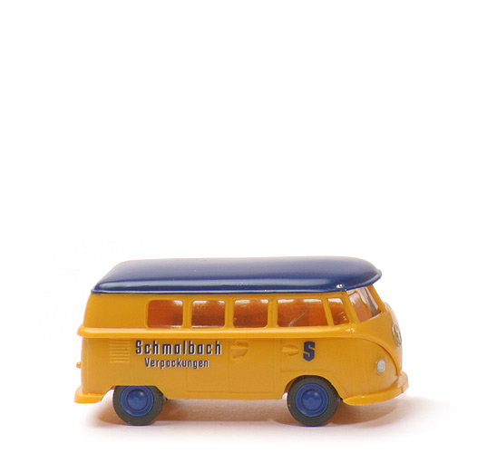 Farbe Karosserie oben | ("honig") gelb | Farbe Karosserie unten | ("honig") gelb | Heckscheibe | klein | Chassis | Teil des Karosserieunterteils | Chassis Version | Neuauflage, Typ D Nest 1 | Bodenprägung | neues WIKING Logo | Rückleuchten | stark erhaben | Mittelholm | oben geschwungen | Verglasung | Typ 3, getönt, mit 3 Bohrungen | Inneneinrichtung | ohne | Bemalung Scheinwerfer | silbern | Bemalung VW-Emblem | silbern | Bemalung Stoßstangen | ohne | Bemalung Kennzeichen hinten | ohne | Bemalung Rückleuchten | rot | Beschriftung | Schmalbach Verpackungen | Beschriftung Art | Druck ultramarin | Räder | 8 mm, schwarz 2-teilig | Radkappen | gewölbt, ultramarin, mit VW-Emblem |