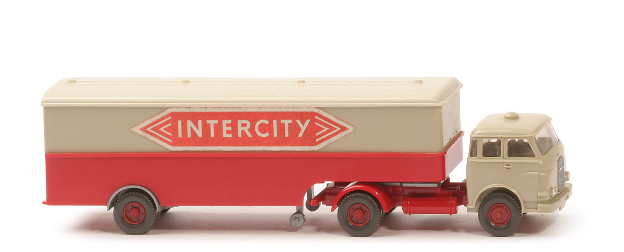 | | Zugmaschine | | Fahrerhaus | hellgelbgrau | | Verglasung | klar | | Sitze | ca. hellgelbgau | | Chassis | rot | | Zughaken | ohne | | Sattelpfanne | für großen Königsbolzen | | Fläche hinter Sattelpfanne | 3 Stege | | Reserverad | mit, Profil grob | | Räder | Profil grob | | Felgen | hellbraunrot | | | Auflieger | | Farbe Dach | perlweiß | | Farbe oben | hellgelbgrau | | Farbe unten | rot | | Türen | perlweiß, neu (mit Scharnierdarstellung) | | Rückleuchten | lang | | Königsbolzen | stark | | Reserverad | mit, geklebt auf Halterung | | Beschriftung | Papieraufkleber "INTERCITY" | | Räder | Profil grob | | Felgen | hellbraunrot |