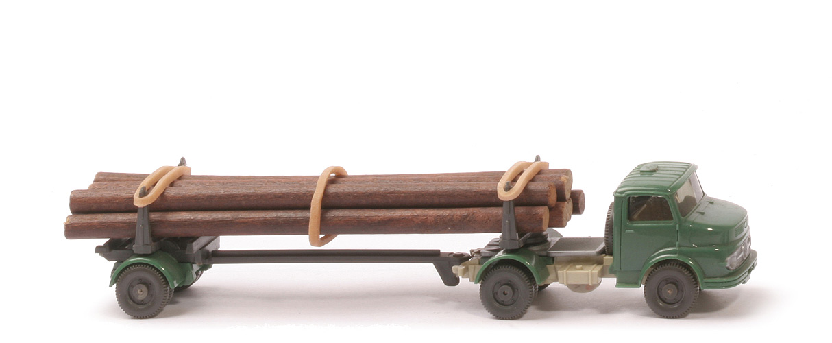 | Zugmaschine | Farbe Kabine | hellpatinagrün | Lüfter | mit | Eckfenster | ohne | Blinker | neben Scheinwerfern | Verglasung | getönt | Inneneinrichtung | ca. hellgelbgrau | Chassis | hellgelbgrau | Radlauf hinten | hellpatinagrün | Sattelpfanne | für großen Königsbolzen | Reserverad | hinter Kabine | Räder | 11mm, einteilig, Profil fein | | Auflieger | Rungen | anthrazit | Deichsel | anthrazit | Gestaltung Deichsel | Zughaken übergreifend | Radlauf | hellpatinagrün | Königsbolzen | stark | Reserverad | unter Chassis | Räder | 11mm, einteilig, Profil fein | Ladung | 7 Baumstämme | Befestigung der Ladung | Gummibänder |