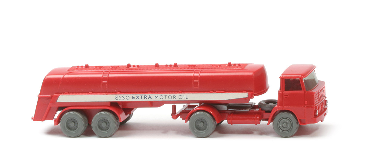 | Zugmaschine | Kabine oben | rot | Kabine unten | rot | Verglasung | getönt | Chassistyp | alt | Zughaken | mit | Fläche hinter Sattelpfanne | geriffelt | Chassisfarbe | rot | Sattelpfanne | alt, mit Steg, für kleinen KöBo | Reserverad | auf Chassis | Räder | einteilig hellgrau | | Auflieger | Farbe Korpus, Unterteil | rot | Farbe Achseinheit | rot | Typ Achseinheit | Made in Germany | Königsbolzen | dünn, eckig, geklebt | Reserverad | ohne | Beschriftung Seite | Esso EXTRA ... (s. Foto) | Schriftfarbe Seite | dunkelblau | Beschriftung Heck | Esso Logo | Räder | einteilig hellgrau |