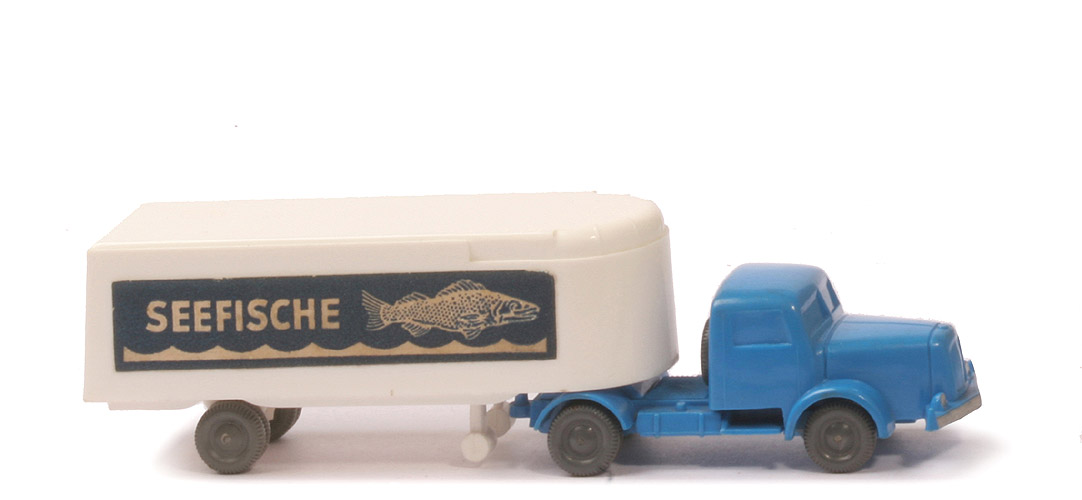 Achsen | Rollachser | | Zugmaschine | Farbe Kabine | himmelblau | Farbe Chassis | himmelblau | Bemalung | Scheinwerfer, Stoßstange | Sattelpfanne | eingesetzt, in Chassisfarbe | Chassis | Version 1a | Achshalterungen | geschlossen | Bodenprägung | WM im Kreis | Reserverad | hinter Kabine | Räder | 10 mm, ältere Version | | Auflieger | Farbe Oberteil | weiß | Farbe Unterteil | weiß | Radlauf | ohne Kotflügel | Bodenprägung | WM im Kreis | Rückleuchten | ohne | Dach | glänzend | Aufkleberart | Papier, matt | Beschriftung | Seefische blau/weiß (s. Foto) | Art Beschriftung | Papieraufkleber | Räder | 10 mm, ältere Version |