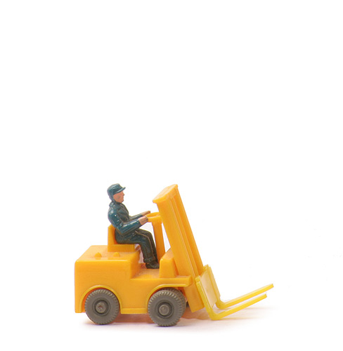 | Farbe Aufbau | gelb | | Fußbodenfläche | glatt | | Bohrlöcher als Dachaufnahme | ohne | | Lenkrad | gelb, 4-speichig | | eingesetztes Chassis | gelb | | hier Bodenprägung | WM | | Hubgestell | gelb | | Hubarme | zitronengelb | | Fahrer | ca. ozeanblau | | Bemalung Fahrer | Gesicht und Hände | | Räder Farbe | ca. staubgrau | | Räder vorne | 7 mm, Doppelbereifung | | Räder hinten | 7 mm, Einfachbereifung |