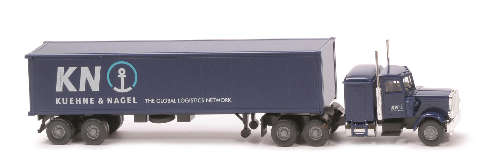 | Zugmaschine | Kabine | nachtblau, mit Scheibenwischern | Dach | mit 5 Positionsleuchten | Haube/vordere Kotflügel | nachtblau, kippbar, Blinker auf Kotflügel | Seitenaggregate | nachtblau | Grill, Scheinwerfer, Stoßst. | verchromt, mit Kennzeichen | Schlafkabine | nachtblau | hier Dach | nachtblau | Auspuffrohre, Tanks | verchromt | Chassis, Motor, Kotflügel, ... | schwarz | Kardanplatte | schwarz | hier Bodenprägung | neues WIKING-Logo, Germany | Sattelpfanne | silbern, für großen Königsbolzen | Bedruckung Kabine | Türen "KN, ..." | Reserverad | ohne | | Container | Art | Glattwand | Farbe | nachtblau | Türen | nachtblau | Beschriftung | "KN, Kühne Nagel..." (s. Foto) | | Auflieger | Typ | für Peterbilt, Achsaggregat nach hinten versetzt | Farbe | schwarz | Reserverad | mittig unter Chassis gesteckt | Unterfahrschutz | mit | Bodenprägung | neues WIKING-Logo, Germany, Berlin-W | | Räder | Typ | 12 mm, Felgen eingesetzt | Felgen | 8-Loch silbern |