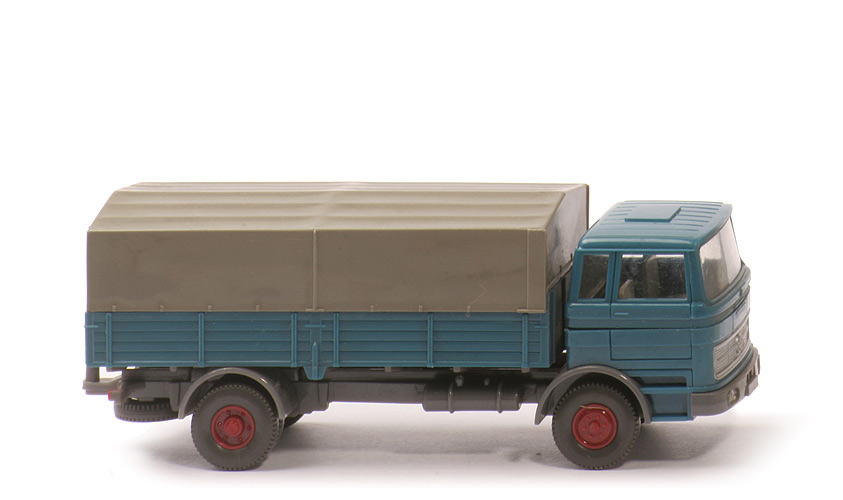 | Kabine oben | azurblau | | Kabine unten | azurblau | | Streifen | ohne | | Verglasung | klar | | Inneneinrichtung | ca. hellgelbgrau | | Lenkrad | ohne | | Stoßstange, Radlauf vorn | staubgrau | | hier Aussparung | mit | | Chassistyp | Zughaken verstärkt | | Chassisfarbe | staubgrau | | Radlauf hinten | staubgrau | | Reserverad | geklebt | | Pritsche | azurblau | | Pritschengestell | staubgrau | | Pritscheneinlage | silber | | Plane | ca. steingrau | | Räder | 12mm, Profil fein | | Felgen | hellbraunrot |