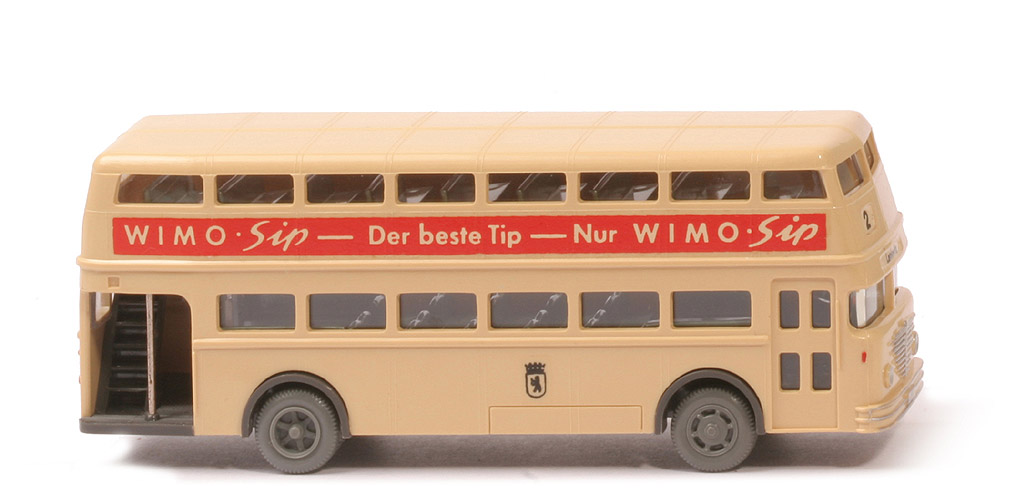 | Karosserie Farbe | hellbeige | | Karosserie Typ | Einstieg hinten offen | | Verglasung | klar | | Fahrer Farbe | ca. grünmetallic | | Fahrer Typ | mit Lenkrad vergossen | | Fahrer Bemalung | Gesicht, Hände | | Sitze Farbe | ca. grünmetallic | | hintere Fahrgastraumbegrenzung | mit | | Treppe hinten | mit | | Chassis Farbe | anthrazit | | Kardanelement Farbe | anthrazit | | Version Chassis | ohne kreisrunde Verstärkung | | Bodenprägung | WM | | Werbebeschriftung | Wimo Sip ... (s. Foto) | | Zielbeschriftung vorne | 2 Lankwitz schwarz auf weiß | | Stadtwappen | schwarz | | Art der Beschriftung | Abziehbilder | | Bemalung vorne | Scheinwerfer, Büssing-Spinne, Stoßstange silber | | weitere Bemalung | vorne Blinker rot, 4 Rückleuchten rot | | Räder Typ | 12 mm, einteilig, ca. betongrau | | Felgen | integriert |