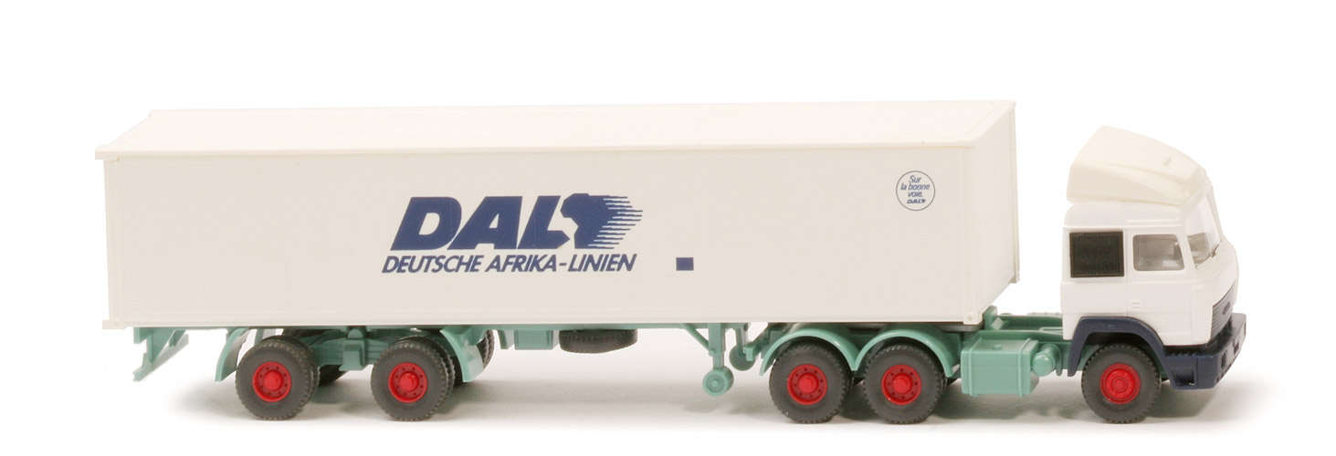 | Zugmaschine | Kabine, Dachspoiler | weiß | Verglasung | klar | hintere seitl. Kabinenfenster | schwarz geschlossen | Inneneinrichtung | ca. silbergrau, Lkr integriert | Reserverad | ohne | Stoßstange, Grill | stahlblau | Ansaugstutzen | schwarz | Chassis | türkis | Bodenprägung Chassis | neues WIKING-Logo, Berlin-W, Germany | Radlauf hinten | 2-teilig, türkis | Räder | Profil grob | Felgen | 8-Loch-Felgen, rot | | Container | Art | 40 ft Glattwand-Container | Farbe | weiß | Türen | neu | Beschriftung | DAL ... (s. Foto) | Beschriftung Art | Druck stahlblau | | Auflieger | Farbe | türkis | Unterfahrschutz | mit | Rückstrahler | am Unterfahrschutz | Königsbolzen | stark | Räder | Profil grob | Felgen | 8-Loch-Felgen, rot |