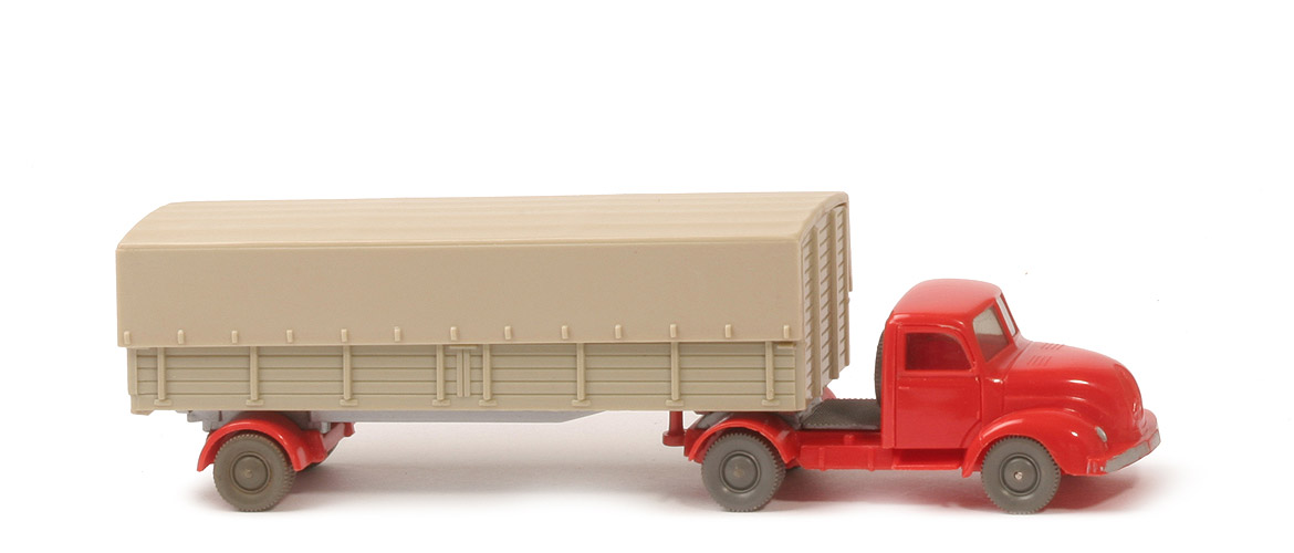 | | Zugmaschine | | Farbe Kabine | orangerot | | Version Kabine | Typ 3 - ohne Schiltz | | Stoßstange | abgeschrägt | | Verglasung | getönt | | Farbe Chassis | orangerot | | Bemalung | Scheinwerfer, Stoßstange | | Sattelpfanne | alt, ohne Steg, für kleinen KöBo | | Achshalterungen | geschlossen | | Bodenprägung | WM (ohne Kreis) | | Reserverad | hinter Kabine | | Räder | 10 mm, neuere Ausführung | | | Auflieger | | Farbe Pritsche | grünlichbeige | | Farbe Chassis | silbern | | Farbe Achseinheit | orangerot | | Bodenprägung Pritsche | WM im Kreis | | Bodenprägung Chassis | WM hinter Königsbolzen | | Königsbolzen | nach hinten versetzt | | Rückleuchten | ohne | | Nummernschild | mit, silbern bemalt | | Achshalterung | offen | | Räder | 10 mm, neuere Ausführung | | | Plane | | Farbe | hellgelbgrau | | hinten | geschlossen | | Innenprägung | WM in Kreis |