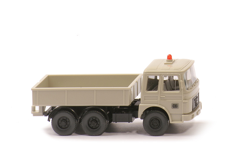 Fahrerhaus | dunkles perlweiß | Verglasung | klar | Inneneinrichtung | ca. lichtgrau, mit Lenkrad | Spiegel | mit | Scheibenwischer | mit | Lüftergitter | ohne | Grill | schwarz, mit Löwe | Motorblock | schwarz | Chassis | schwarz | Warnlicht | orange-transparent | Radlauf | schwarz, 2-teilig | Pritsche | dunkles perlweiß | Pritscheneinlage | ohne | Aufkleber | ohne | Bedruckung | Tür: DB-Logo, schwarz | Reserverad | mit | Räder | 12mm, Profil grob | Felgen | schwarz, 8-Loch |