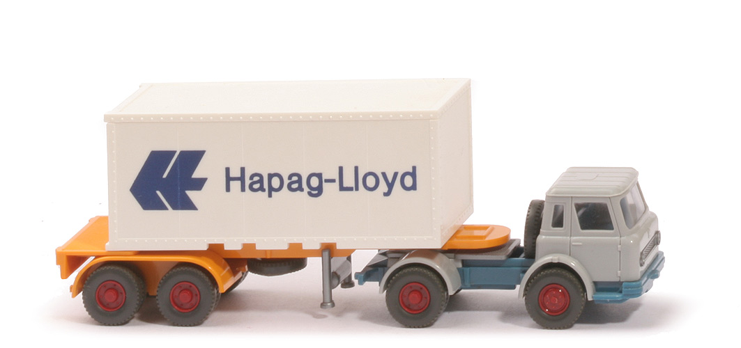 | Zugmaschine | Kabine | silbergrau | Lüfter | mit | Inneneinrichtung | azurblau | Verglasung | getönt | Chassis | azurblau | Radlauf hinten | silbergrau | Sattelpfanne | für großen Königsbolzen | Reserverad | hinter Kabine | Räder | Profil grob | Felgen | hellbraunrot | | Container | Art | 20 ft Glattwand | Farbe | weiß | Türen | alt | Beschriftung | Hapag-Lloyd (s. Foto) | Beschriftung Art | 38mm, ohne Nummer (Werbe) | | Auflieger | Farbe | melonengelb | Variante | mit Markierung | Achseinheit Farbe | melonengelb | Achshalterung | Klemmplatte | Königsbolzen | stark | Räder | Profil grob | Felgen | hellbraunrot |