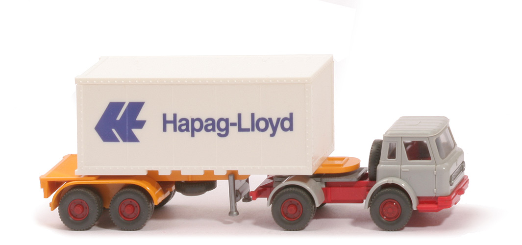 | Zugmaschine | Kabine | silbergrau | Lüfter | mit | Inneneinrichtung | rot | Verglasung | klar | Chassis | rot | Radlauf hinten | silbergrau | Sattelpfanne | für großen Königsbolzen | Reserverad | hinter Kabine | Räder | Profil grob | Felgen | hellbraunrot | | Container | Art | 20 ft Glattwand | Farbe | weiß | Türen | alt | Beschriftung | Hapag-Lloyd (s. Foto) | Beschriftung Art | 38mm, ohne Nummer | | Auflieger | Farbe | melonengelb | Variante | mit Markierung | Achseinheit Farbe | melonengelb | Achshalterung | Klemmplatte | Königsbolzen | stark | Räder | Profil grob | Felgen | hellbraunrot |