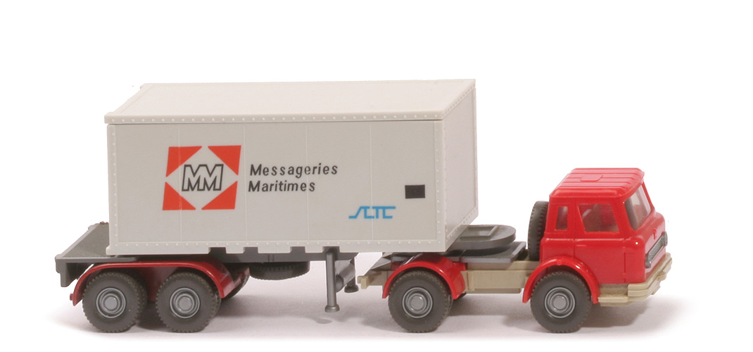 | Zugmaschine | Kabine | (glasiges) rot | Lüfter | mit | Inneneinrichtung | hellgelbgrau | Verglasung | klar | Chassis | hellgelbgrau | Radlauf hinten | rot | Sattelpfanne | für großen Königsbolzen | Reserverad | hinter Kabine | Räder | Profil grob | Radkappen | silbern | | Container | Art | 20 ft Glattwand | Farbe | altweiß | Türen | alt | Beschriftung | Messageries Maritimes (s. Foto) | Beschriftung Art | Druck orange/schwarz/blau | | Auflieger | Farbe | basaltgrau | Variante | mit Markierung, mit Bohrungen neben KoBo | Reserverad | unter Auflieger, gesteckt | Bodenprägung | 52h | Doppelachsaggregat Farbe | hellbraunrot | Doppelachsaggregat Typ | Klemmplatte WIKING u. GERMANY | Hydraulikstützen | silbern, gesteckt | Räder | Profil grob | Radkappen | silbern |