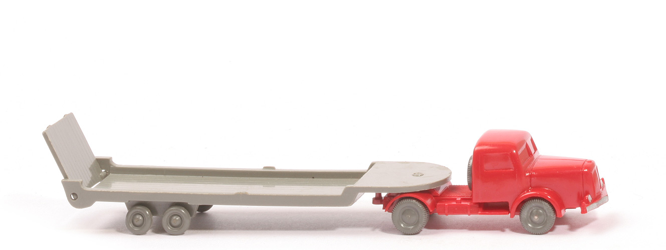 Achsen | Rollachser | | Zugmaschine | Farbe Kabine | rot | Farbe Chassis | rot | Bemalung | Scheinwerfer, Stoßstange | Sattelpfanne | eingesetzt, in Chassisfarbe | Chassis | Version 1a | Achshalterungen | geschlossen | Bodenprägung | WM (ohne Kreis) | Reserverad | hinter Kabine | Räder | 10 mm, Profil, hellgrau | | Auflieger | Achsen | Rollachser | Farbe | betongrau | Typ | vorn rund (Typ 1) | Seilwinde | ohne | Fläche über Drehschemel | mit Prägung WM im Kreis | Rückleuchten | ohne | Rampe | kurz | Stützen | ohne | Bodenprägung | ohne | Königsbolzen | kurz | Räder | 7mm, o. Profil, betongrau |