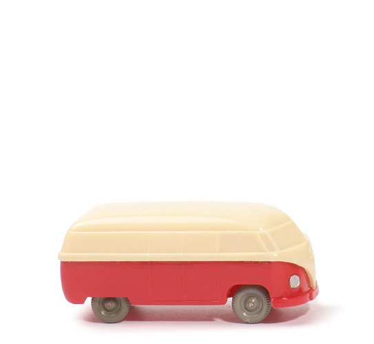 Achsen | Rollachser | Karosserie oben | cremeweiß | Seite | mit einem Seitenfenster | Front | VW Emblem | Karosserie unten | rot | Bodenprägung | nur WM (im Kreis) | Bemalung Scheinwerfer | silbern | Bemalung Stoßstange vorne | ohne | Bemalung Heck | ohne | Räder Typ | 8 mm, mit Profil | Räder Farbe | ca. staubgrau |