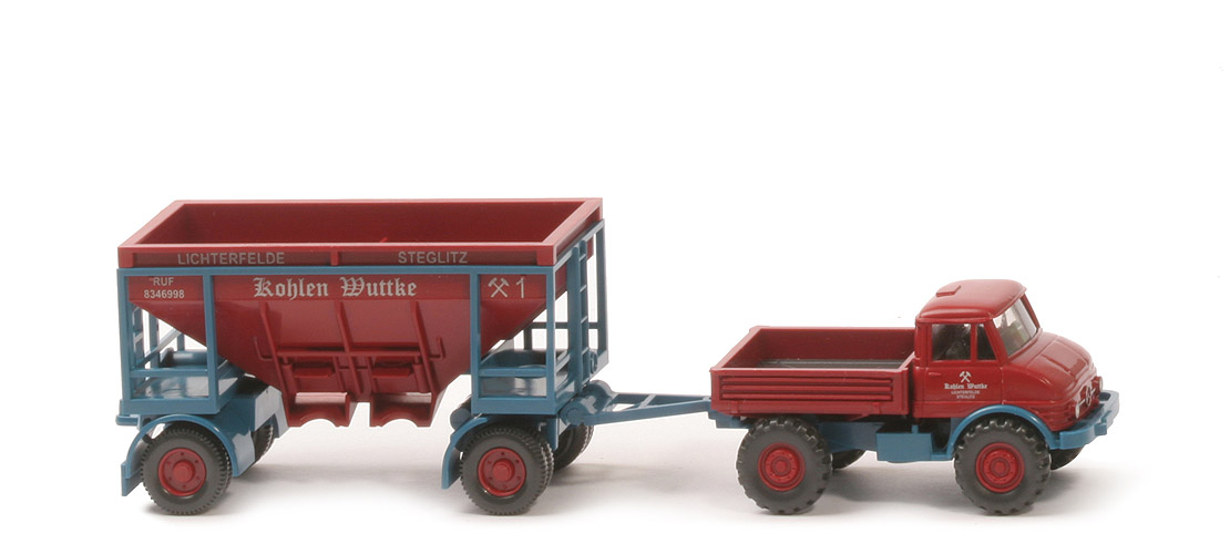 | Unimog 406 | Farbe Kabine | braunrot | Verglasung | klar | Inneneinrichtung | anthrazit | Lenkrad | separat eingesetzt | Chassis Farbe | azurblau | Bodenprägung | neues WIKING-Logo, 370 | Kardanelement Farbe | azurblau | Reserverad | über Chassis (ca. 9 mm) | Pritsche | braunrot | Pritscheneinlage Typ | 6 Längsstreifen und trapezförmige Gravur | Pritscheneinlage Farbe | anthrazit | Bedruckung Scheinwerfer, Stern | silbern | Bedruckung Rückleuchten | ohne | Bedruckung Tür | Zechensymbol, Kohlen Wuttke ... (s. Foto) | Räder Typ | 11 mm, grobstollig, anthrazit | Felgen | 8-Loch, braunrot | | Anhänger | Schüttbehälter | braunrot | Aufbaugestell | azurblau | hier Bodenprägung | WIKING, Germany (altes Logo) | Drehschemel-Unit | azurblau | Kotflügel-Unit hinten | azurblau | Deichsel | azurblau | Beschriftung | Kohlen Wuttke ... (s. Foto) | hier Kenn-Nr. des Anhängers | "1" | Räder | 11 mm, 2-teilig | Felgen | 6-Loch, braunrot | | Links | weitere Anhänger | Nummer 2 | weitere Anhänger | Nummer 3 |