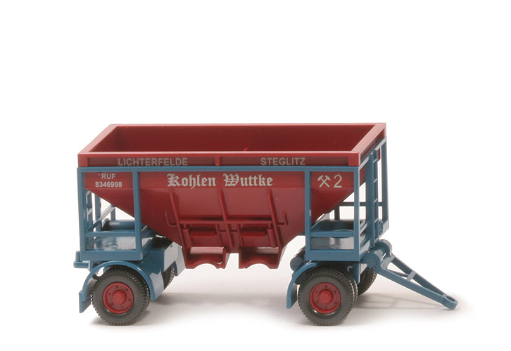 Schüttbehälter | braunrot | Aufbaugestell | azurblau | hier Bodenprägung | WIKING, Germany (altes Logo) | Drehschemel-Unit | azurblau | Kotflügel-Unit hinten | azurblau | Deichsel | azurblau | Beschriftung | Kohlen Wuttke ... (s. Foto) | hier Kenn-Nr. des Anhängers | "2" | Räder | 11 mm, 2-teilig | Felgen | 6-Loch, braunrot |