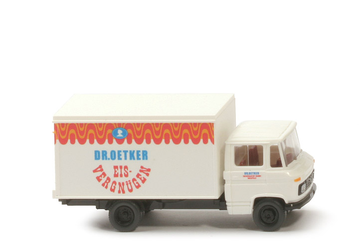 | Farbe Kabine | weiß | | Scheibenwischer | mit | | Verglasung | klar | | Inneneinrichtung | ca. weinrot, Lkr integriert | | Bedruckung Front | Blinker orange, Scheinwerfer, Stern ... silbern | | Bedruckung Türen | Dr. Oetker, Tiefkühlkost GmbH Bielefeld | | Chassisfarbe | schwarz | | Platte zur Achshalterung | schwarz | | Radlauf hinten | schwarz | | Bodenprägung Chassis | Wiking Germany | | Kofferaufbau | weiß | | Beschriftung Seiten und Heck | Dr. Oetker Eis-Vergnügen | | Beschriftung Art | Druck blau/orange/rot | | Kofferboden | schwarz | | Bedruckung Kennzeichen hinten | ohne | | Bedruckung Rückleuchten | ohne | | Räder | anthrazit, 9 mm, Felgen eingesetzt | | Felgen | neu, schwarz |