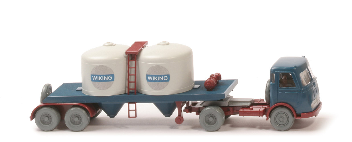 | Zugmaschine | Kabine Farbe | ca. ozeanblau | Fenstersteg | breit | Fixierung Reserverad | mit | Verglasung | leicht getönt | Inneneinrichtung | "oxidrot" | Grill | integriert, gesilbert | Chassis | "oxidrot" | Bodenprägung | neues Wiking-Logo | hintere Stoßstange links | mit | Zughaken | mit, Mikro-Ausführung | hintere Stoßstange rechts | mit | Reserverad | hinter Kabine | Sattelpfanne | für großen Bolzen mit Steg | Werkzeugkiste | ohne | Räder | 12 mm, 10-Loch-Felgen, ca. staubgrau | | Auflieger | Tanks | helles altweiß | Basis | ca. ozeanblau | Königsbolzen | stark | Leitern, Pumpeinheit | "oxidrot" | Achseinheit | "oxidrot" | Typ Achseinheit | neues Wiking-Logo | Stützrollen | "oxidrot" | Reserverad | hinten senkrecht auf Achseinheit | Beschriftung | Wiking (s. Foto) | Art der Beschriftung | Papieraufkleber | Räder | 12 mm, 10-Loch-Felgen, ca. staubgrau |
