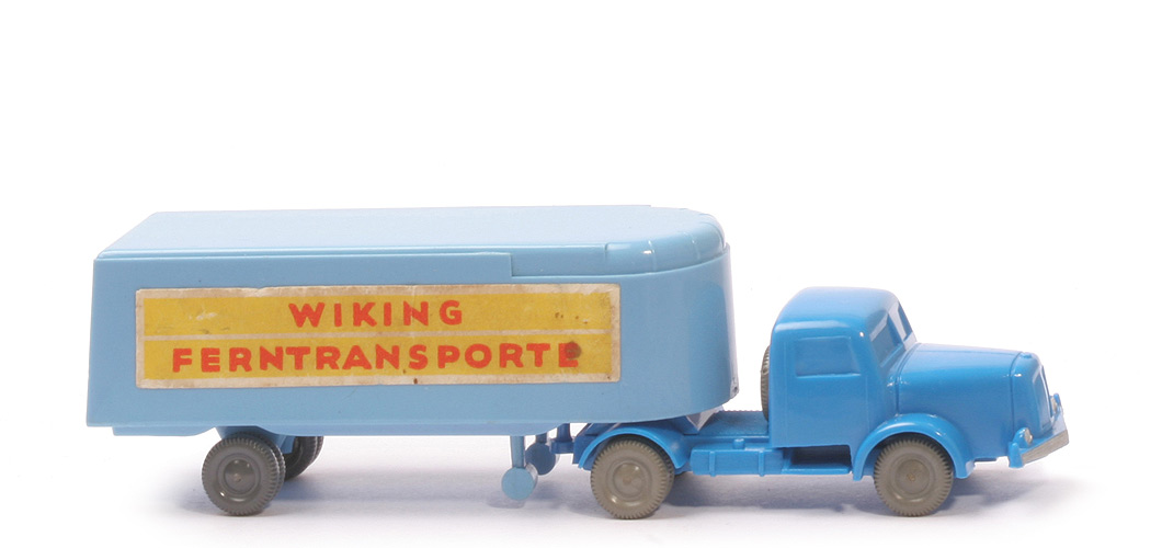 Achsen | Rollachser | | Zugmaschine | Farbe Kabine | himmelblau | Farbe Chassis | himmelblau | Bemalung | Scheinwerfer, Stoßstange | Sattelpfanne | eingesetzt, in Chassisfarbe | Chassis | Version 1a | Achshalterungen | geschlossen | Bodenprägung | WM (ohne Kreis) | Reserverad | hinter Kabine | Räder | 10 mm, mit Profil, dunkles basaltgrau | | Auflieger | Farbe Oberteil | lilablau | Farbe Unterteil | lilablau | Radlauf | ohne Kotflügel | Bodenprägung | WM im Kreis | Rückleuchten | ohne | Dach | glänzend | Aufkleberart | Papier, matt | Beschriftung | Ferntransporte (s. Foto) | Beschriftung Farbe | gelb mit roter Schrift | Räder | 10mm, mit Profil, ca. basaltgrau |