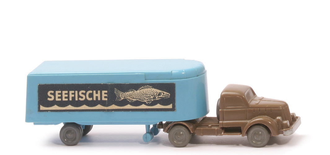 Achsen | Rollachser | | Zugmaschine | Farbe Kabine | blassbraun | Farbe Chassis | blassbraun | Bemalung | Scheinwerfer, Stoßstange | Sattelpfanne | eingesetzt, in Chassisfarbe | Chassis | Version 1b | Achshalterungen | geschlossen | Bodenprägung | WM (ohne Kreis) | Reserverad | hinter Kabine | Räder | 11mm, ältere Ausführung | | Auflieger | Farbe Oberteil | babyblau | Farbe Unterteil | babyblau | Radlauf | ohne Kotflügel | Bodenprägung | WM im Kreis | Rückleuchten | ohne | Dach | glänzend | Aufkleberart | Papier, matt | Beschriftung | Seefische weiß/blau (s. Foto) | Räder | 11mm, ältere Ausführung |